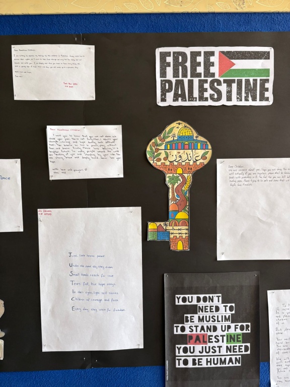 Ayrıca öğrencilerimiz, konuyla ilgili duygu ve düşüncelerini yansıttıkları bilgilendirici ve anlamlı bir pano hazırlamışlardır. Bu pano, hem okul koridorlarında farkındalık oluşturmuş hem de öğrencilerin barış, kardeşlik ve insanlık temalı mesajlarını yansıtan güçlü bir görsel çalışma olmuştur.
